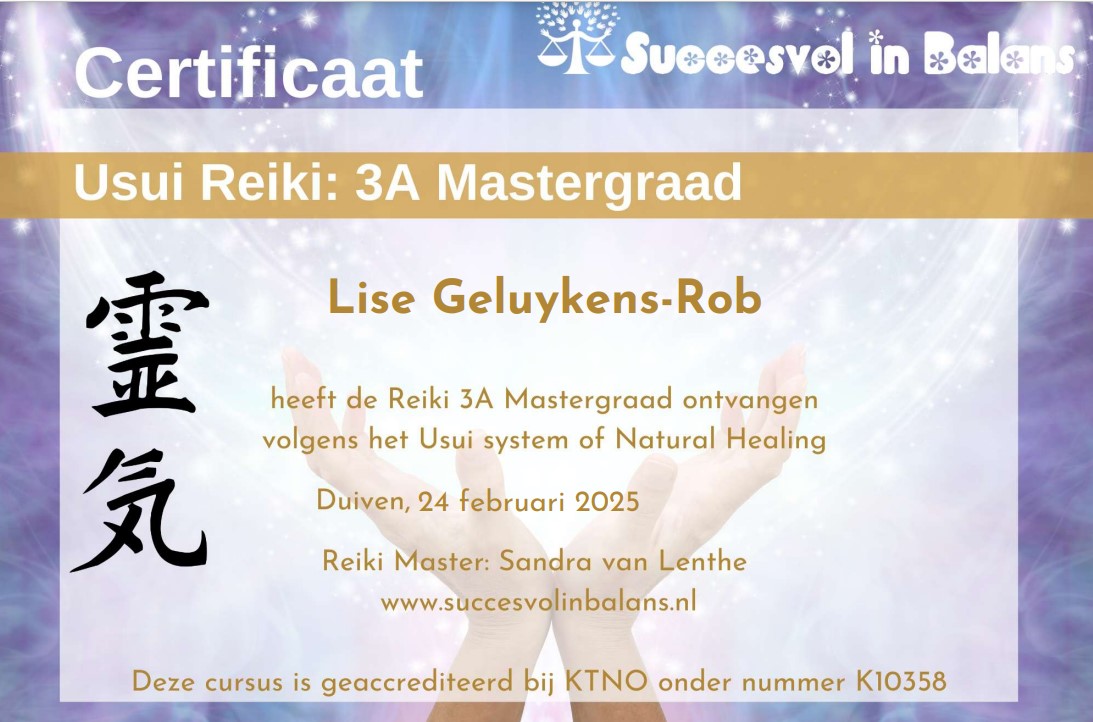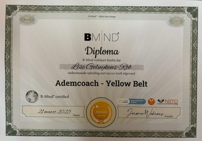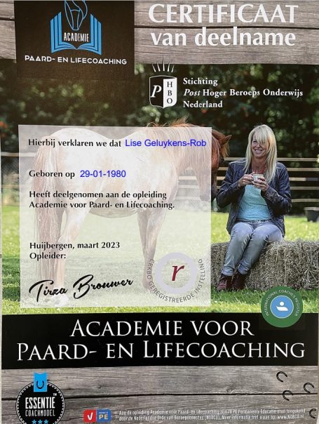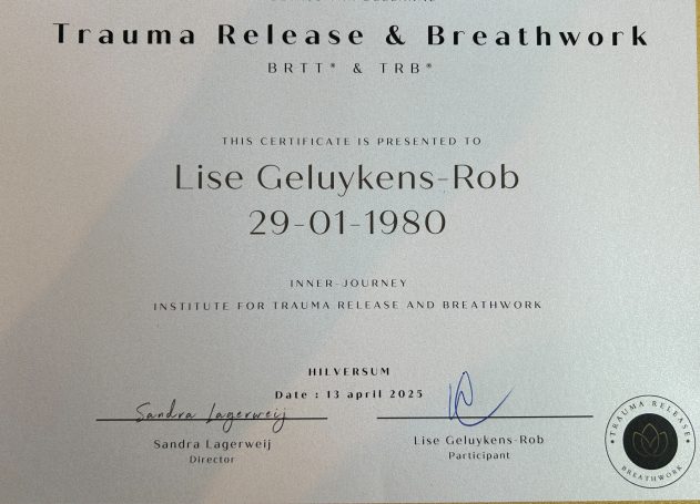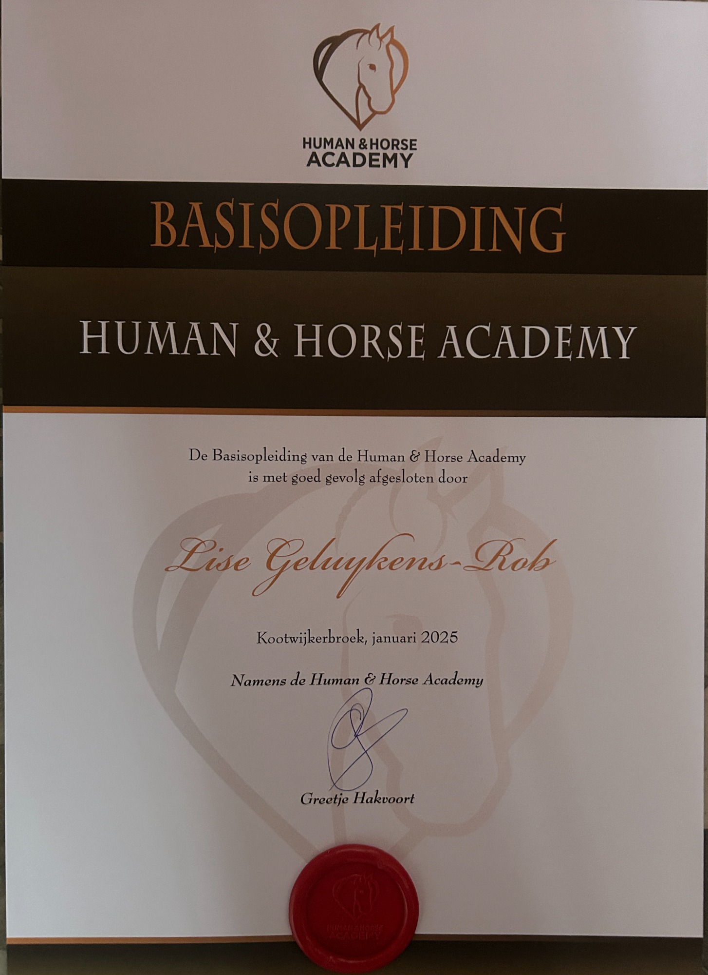 Daarnaast ben ik gediplomeerd Ademcoach, Reiki Master en opgeleid in Trauma Release & Breathwork, waardoor ik mensen mag begeleiden naar meer zachtheid, regulatie en innerlijke rust. Ook behaalde ik mijn diploma in Lifecoaching, wat mij helpt om zowel mens als paard te begeleiden vanuit helderheid, compassie en praktische stappen.