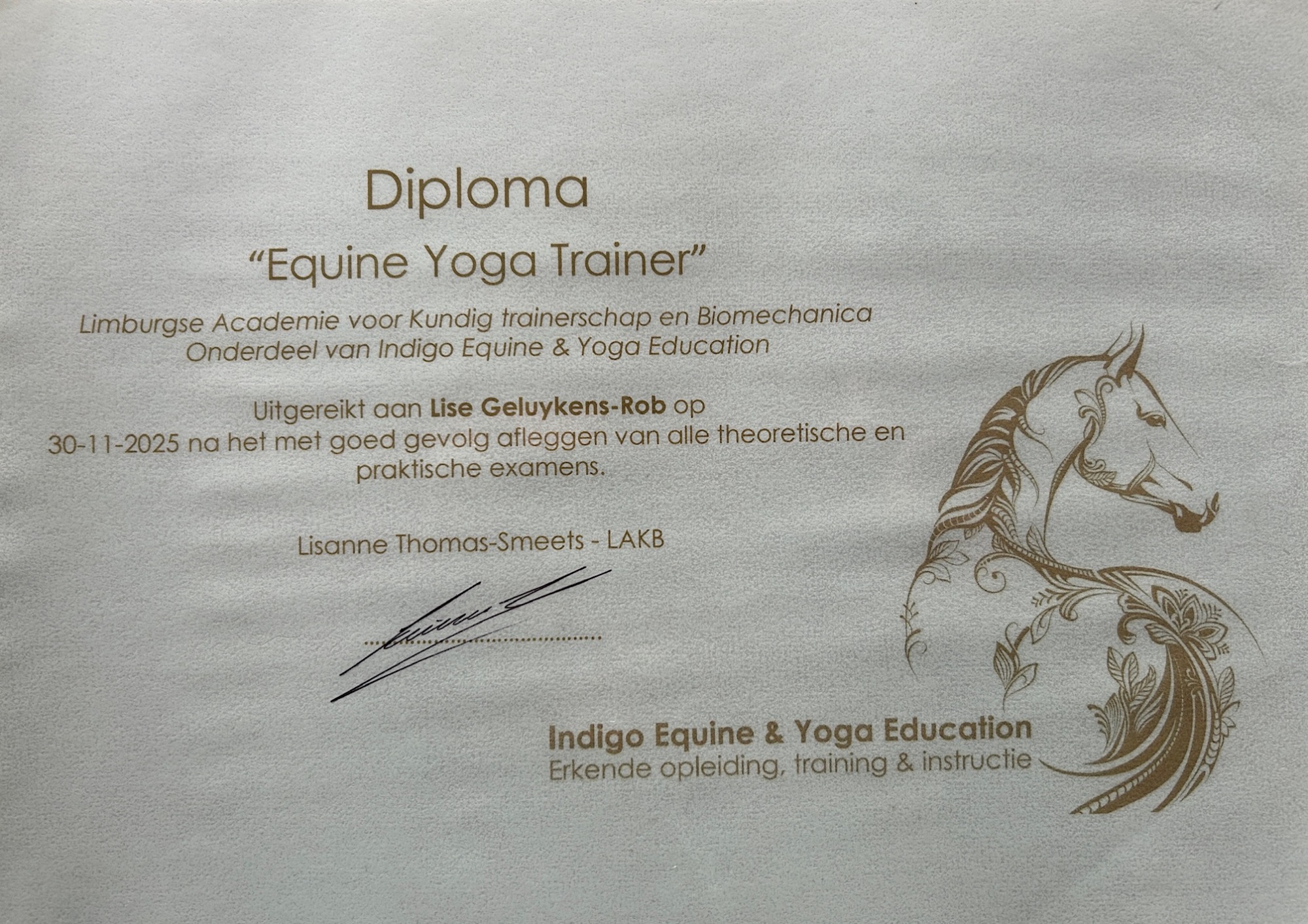 Met liefde en aandacht heb ik in de afgelopen jaren een breed fundament opgebouwd binnen zowel het werken met paarden als het begeleiden van mensen. Ik ben opgeleid tot Equine Yoga Trainer en Human & Horse Trainer, waar ik de verbinding tussen lichaam, adem en energie heb leren verdiepen – zowel bij mens als paard.