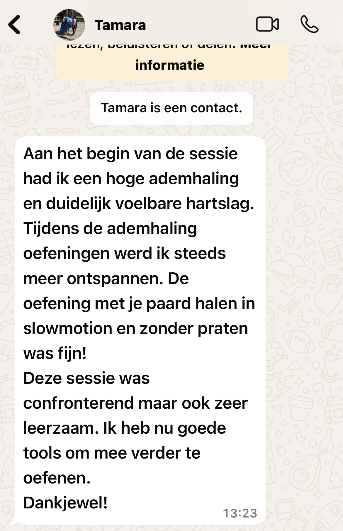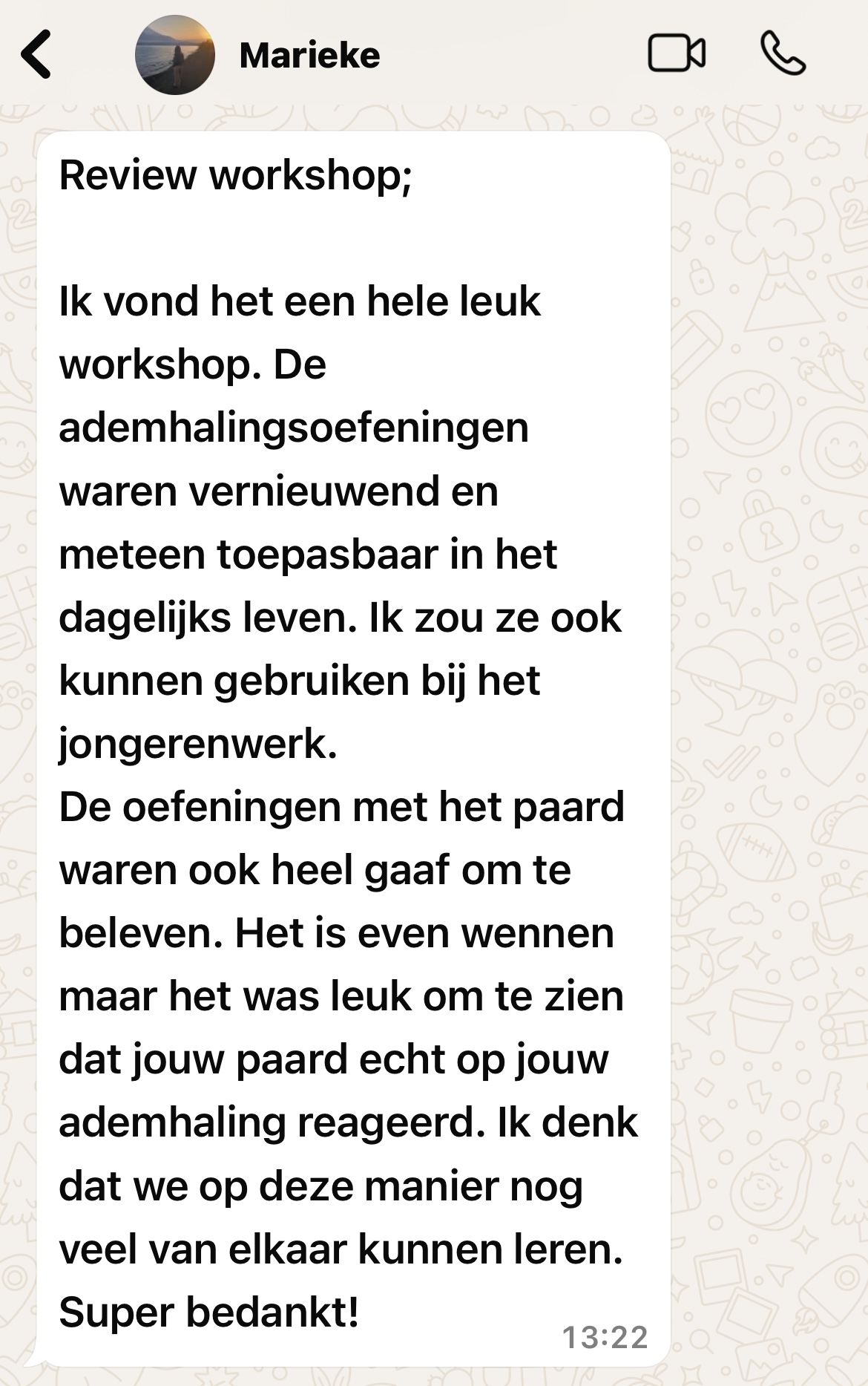 "Lise heeft me top geholpen tijdens een sessie met mijn paard, toen de spanning bij zowel mij als hem opliep. Op een zeer prettige, rustige manier leerde Lise mij ademhalingsoefeningen aan. Al snel voelde ik me comfortabel en kreeg ik mezelf weer onder controle. Doordat ik rustiger werd, zakte mijn paard ook weer in energie. Heel fijn! Hier kan ik ook thuis mee aan de slag, dank je wel Lise!"