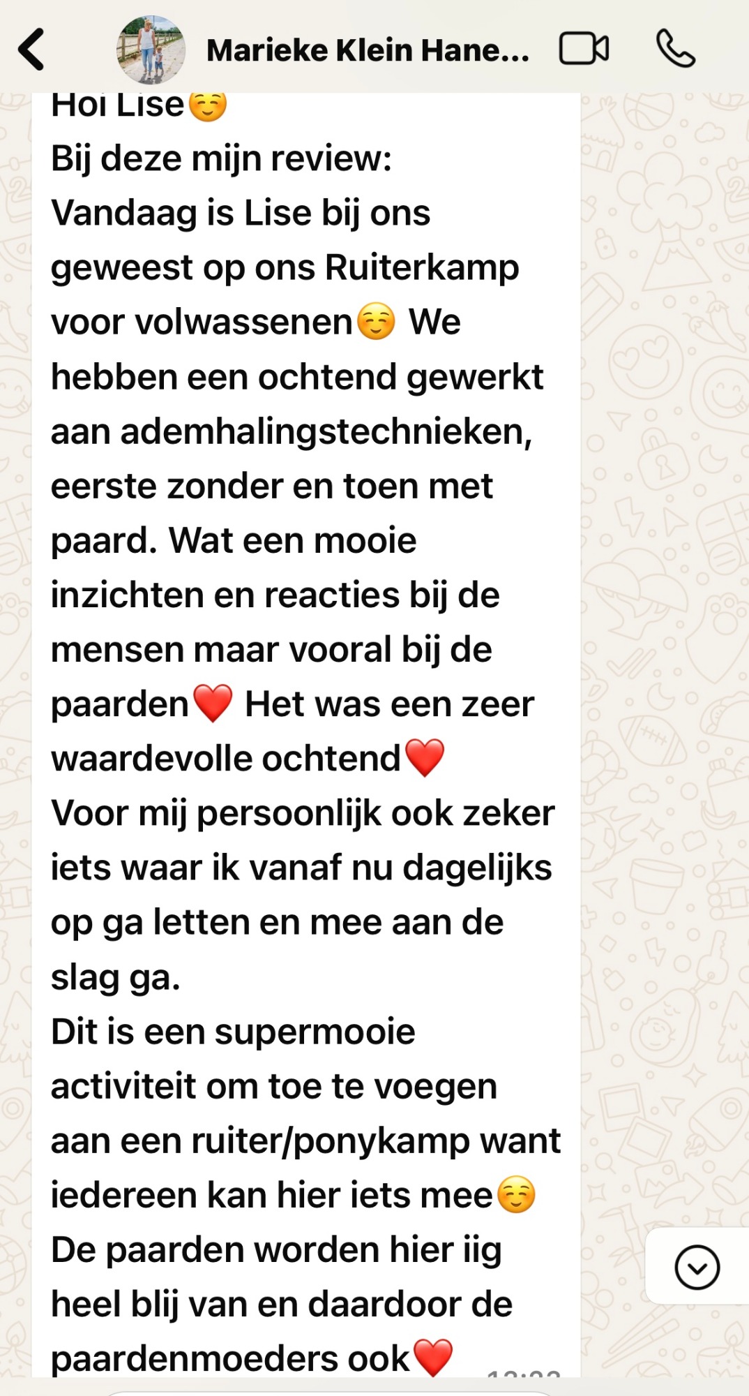 "Lise heeft mij een ademsessie gegeven met mijn paard. Het was zo bijzonder wat voor effect dit had op ons beide. Dit was precies wat ik nodig had"